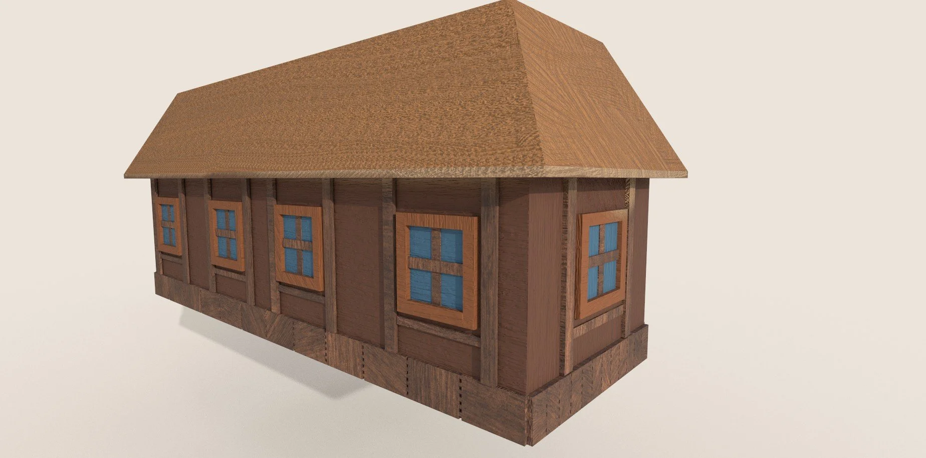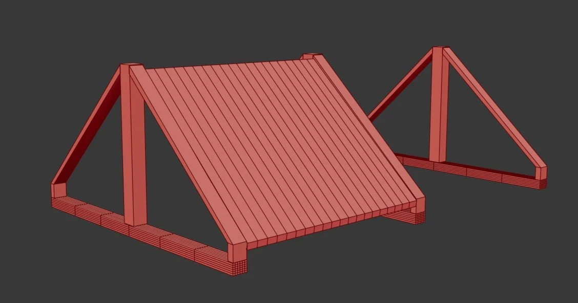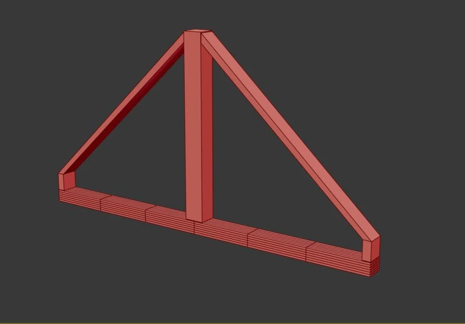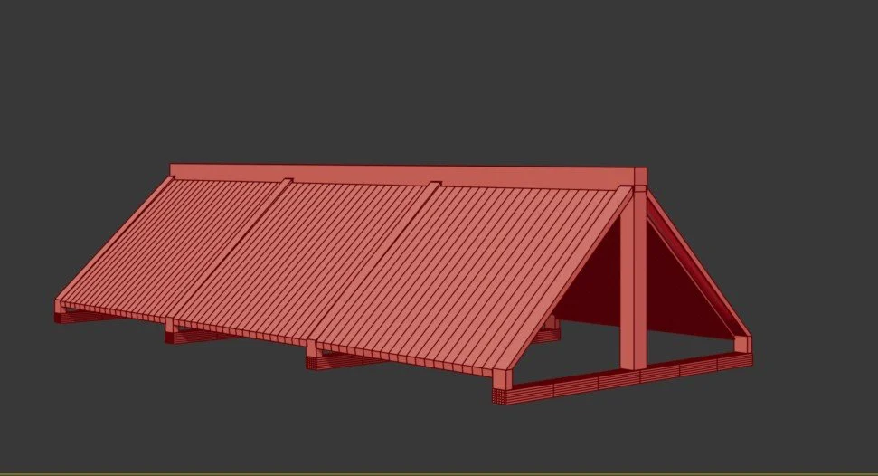 The roof frames were cloned using the array tool. This was done to create equal spacing between the assets to ensure that the roof was equal. The design of the wooden planks was undertaken by using a cube to create the plank, which was placed at the same angle at the frame. I was then able to use the array tool to create the roof in order to maintain reusability and allow for accurate spacing. This process allowed the model to look accurate and even between both the frames and the planks.