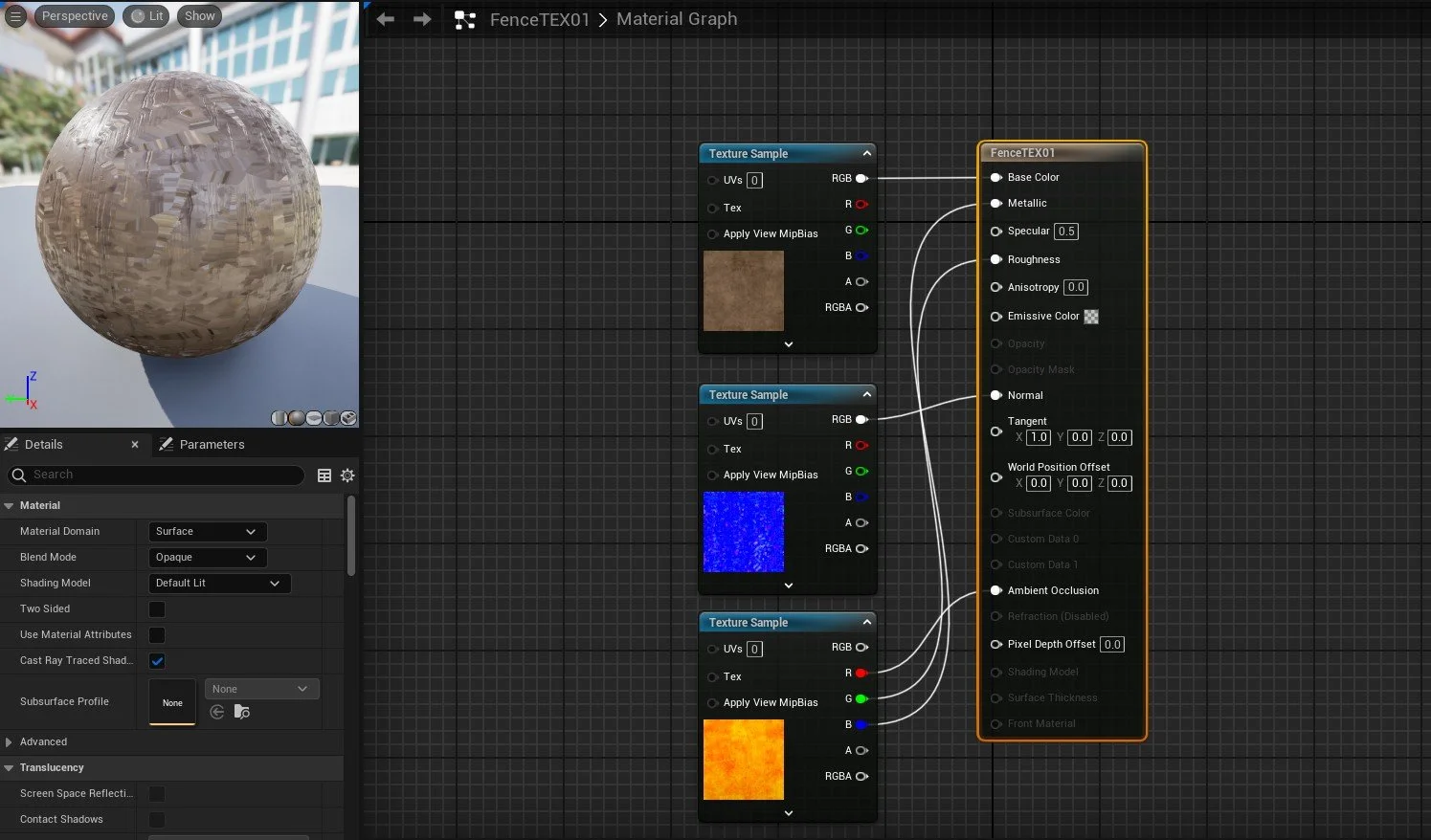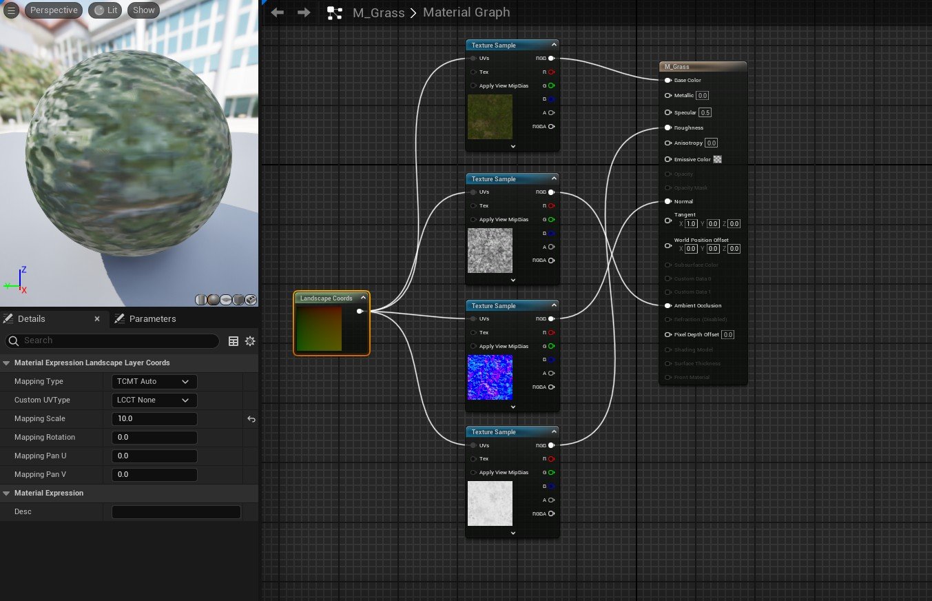 The first step was to add the landscape material and begin attaching the textures within the material graph. Since this texture was downloaded from the UE5 marketplace, I understood that I only needed 4 specific textures to create the material: Base material, Roughness, AO (Ambient Occlusion) and finally Normal maps. These were combined within the material graph to produce surface detail with realistic lighting and depth across the landscape.