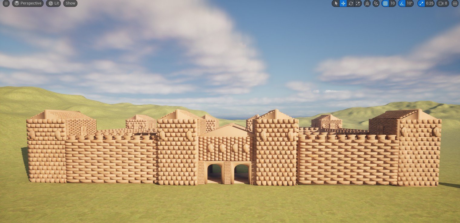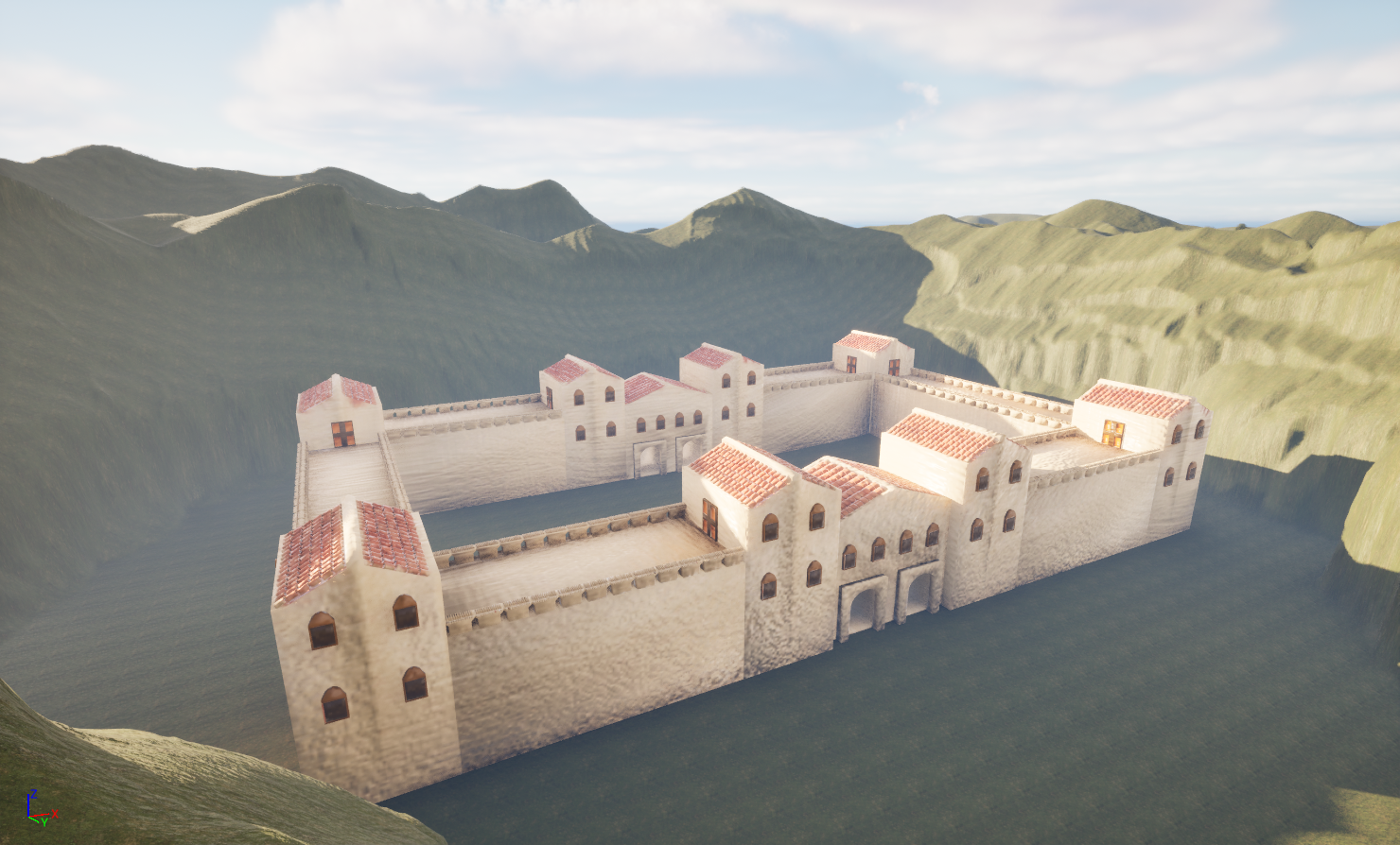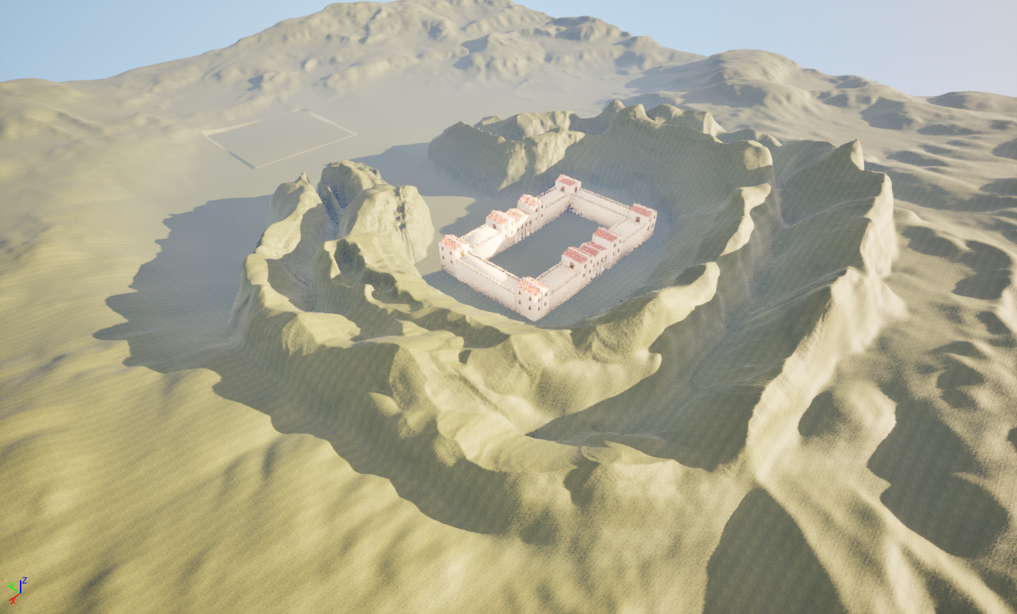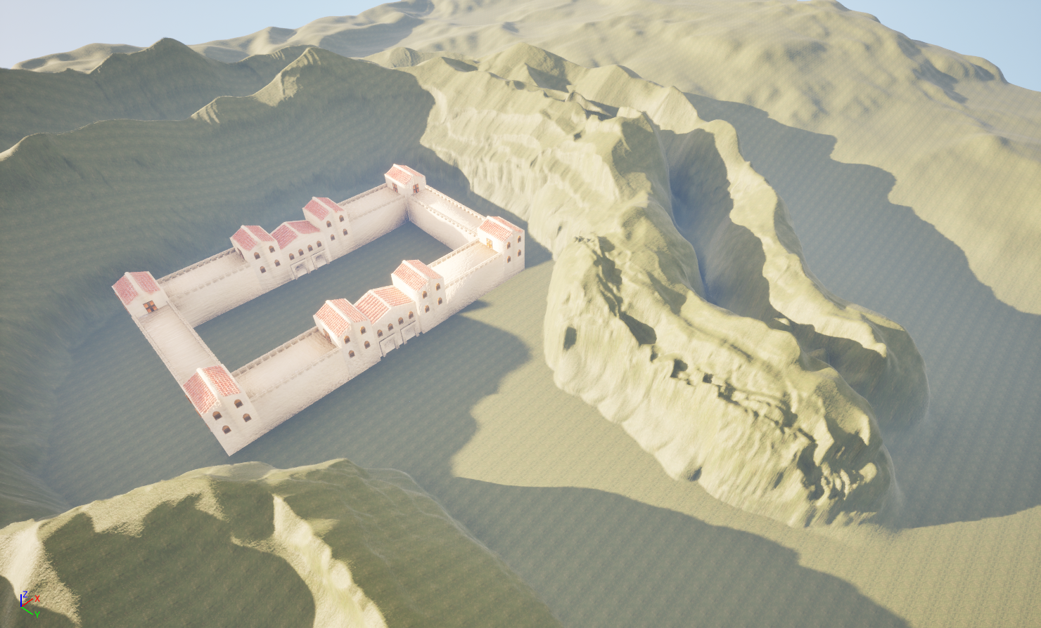 The construction of the landscape began by sculpting the terrain upwards to create hills that resembled a semi-circle shape that surrounds the scene enough, while also offering a clear and direct path for a player. To understand the scale of the scene, I decided to import the Roman fort into the scene, since this was the hero asset of the Diorama.