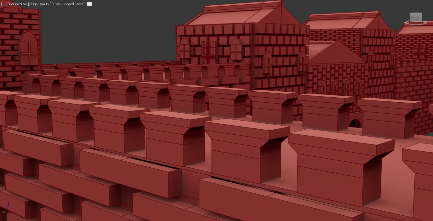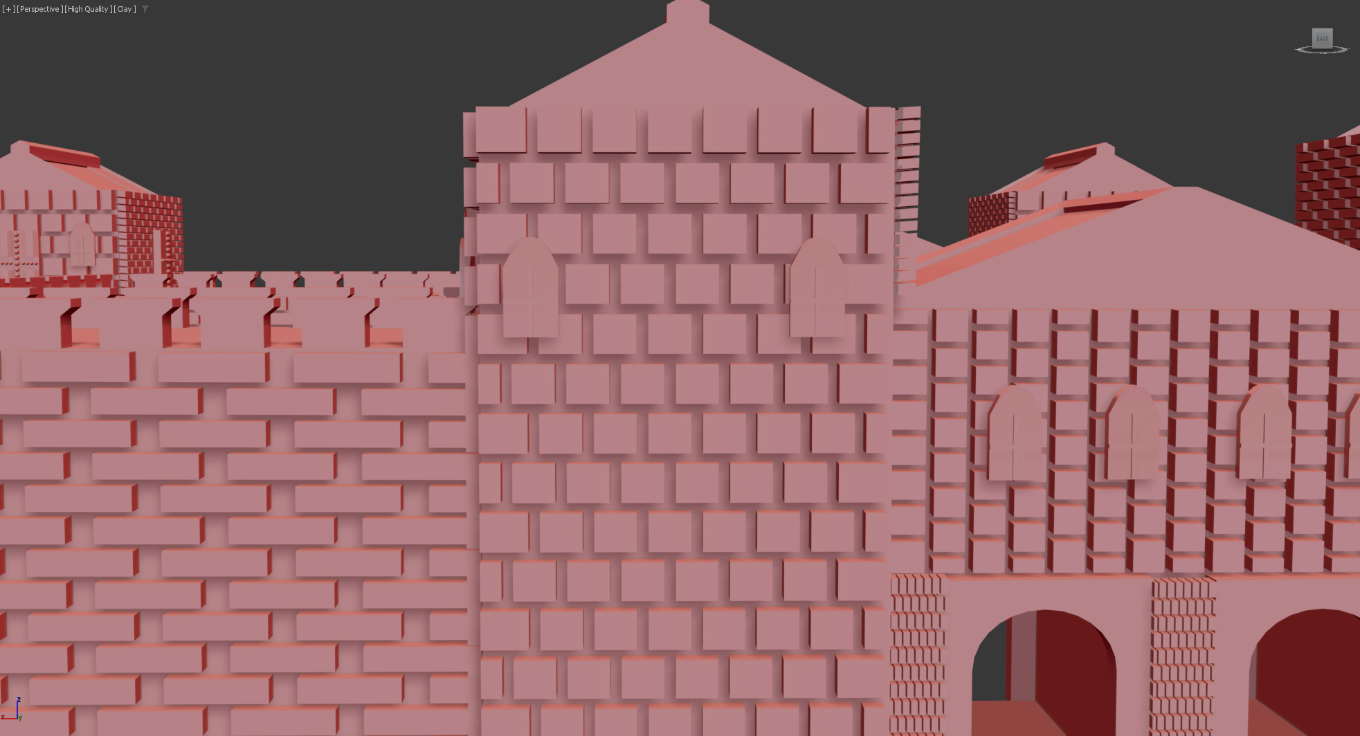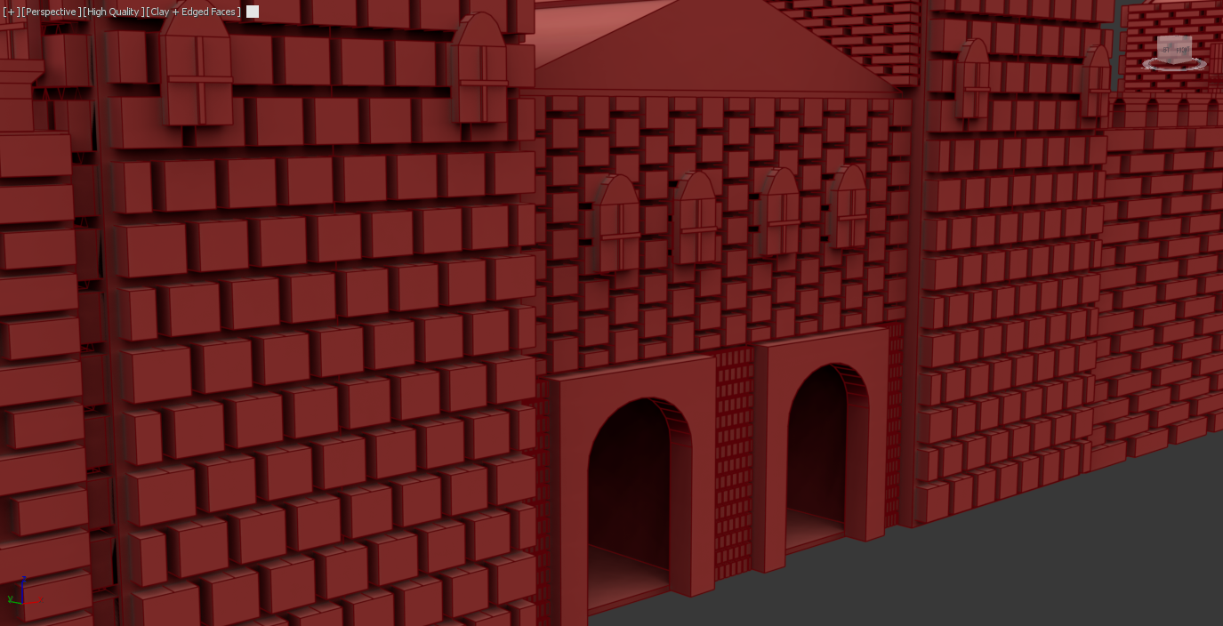The process for adding detail involved adding the arched windows and the bricks to the towers, the only difference being the addition of new polygonal modelling. The bricks were made again to fit the specific shapes and dimensions, which, compared to the walls and main gate was very different. Once one of the towers was completed, I could clone it and quickly place it in the specific locations.