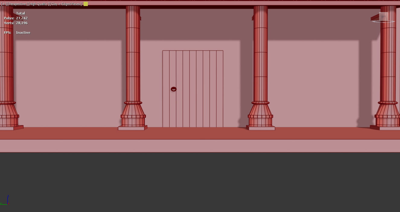 The pillars acted to support the lower roof; this was a design that could have been completed using Roman pillars or basic cubed boxes. Although the reference image showed simpler support beams, I decided to create a more authentic asset that reflected the Roman era. The door proved to be slightly harder to do due to the angle of the reference image, which meant I could not see details like the handle as easily. To fix this, I added a torus shape to act as the handle, which felt more appropriate for an ancient/medieval rather than a modern structure.