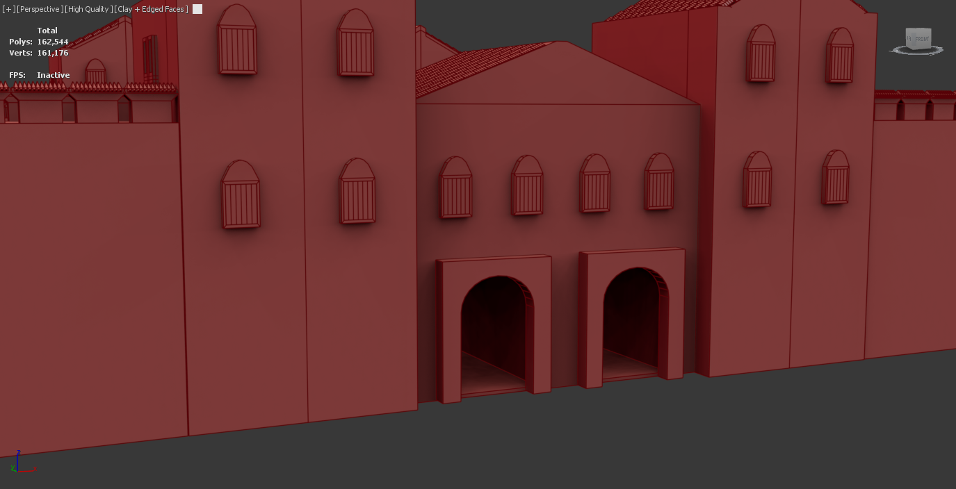 While I did decide to remove the bricks, I did want to make some key refinements to minor assets like windows, doors and the barriers and finally tiles . The changes I made to the windows were to add wooden planks to the windows, which added a more realistic appearance. The windows were simply flat surfaces, and this lack of detail would not represent the vision I had for the project. The doors needed improvement as they had uneven surfaces and visual detail that I do not believe was a suitable design. Both the windows and doors did have problems with the polygonal selection, so I knew this was something that needed to be fixed. The wall barricades contain gaps between each of the assets, which was a mistake I made while using the array tool. The changes for this are to add spikes, which I feel would make the fort look more secure and more historically realistic. The tiles were not originally added, mainly due to the already high poly count due to the bricks. Since their removal, I decided to add them to the model. The tiles were created by bringing in a cylinder and cutting it in half to create the shape, i then used the shell modifier to create the thickness. this then was placed on the roof where I could duplicate using the array tool along the roofs.