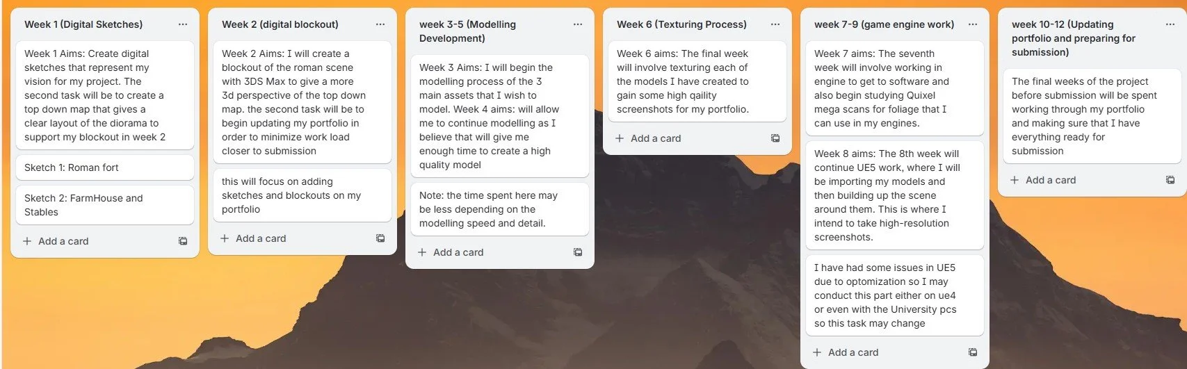 My Trello board outlines when I plan to begin each stage of the project to help me keep a clear and concise plan, which will allow me to keep track of my progress. The first step to make the Trello board was to understand what tasks would be needed while also thinking about how much time would be required for each task. The sketching and blockout stages would be relatively straightforward, as I knew once I identified the right reference images that I felt suited my vision, I could begin sketching through Figma. The Modelling development section is where I expect more time to be used. I mentioned below that the time committed to the project will be determined by the level of detail. The texturing process should only remain one week, as I believe that my sketches will have a clear art direction, which will allow me to begin texturing without having any delays. The game engine work will very likely be two weeks, perhaps more. I made it clear than challenge here would be dealing with UE5 optimisation and other technical issues. If needed, I will either keep a week free to catch up if necessary, or I will simply move to Unity or UE4, which will still allow me to finish of the project.