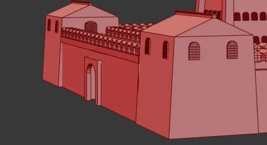 The archway entrance was created using the line tool. Since the cut was already made, I just needed to make the arch to fit the gap made. I opted to model this with the line tool because the bend modifier did not produce the results I aimed for. This is why I decided to use the line tool, as I could create a specific design while not worrying about bad typology. Overall, the feedback here focused on architectural details and reinforcing historically appropriate features across the walls and towers.