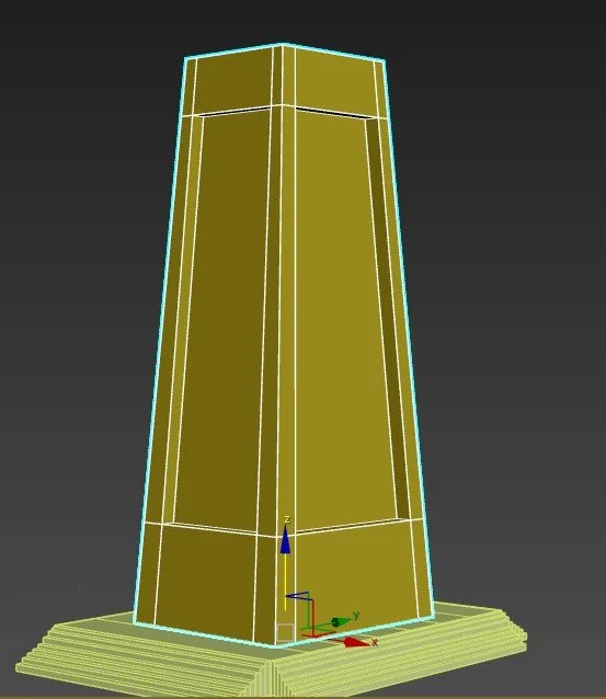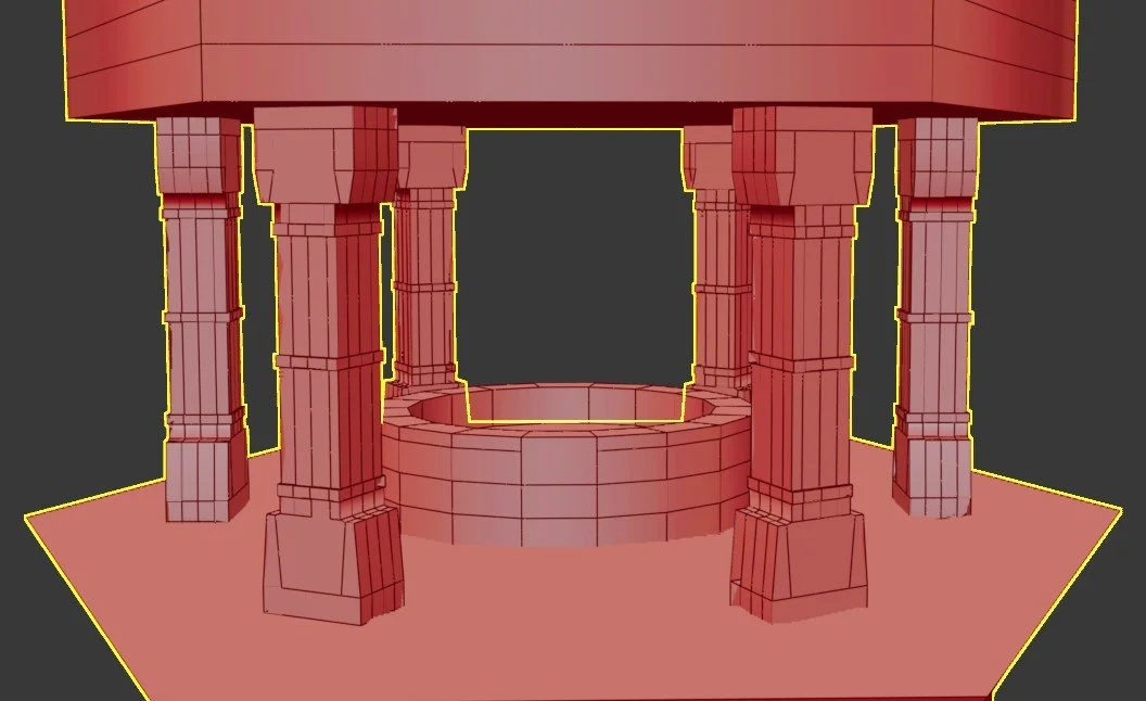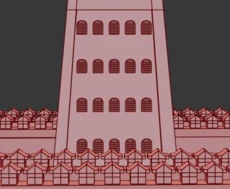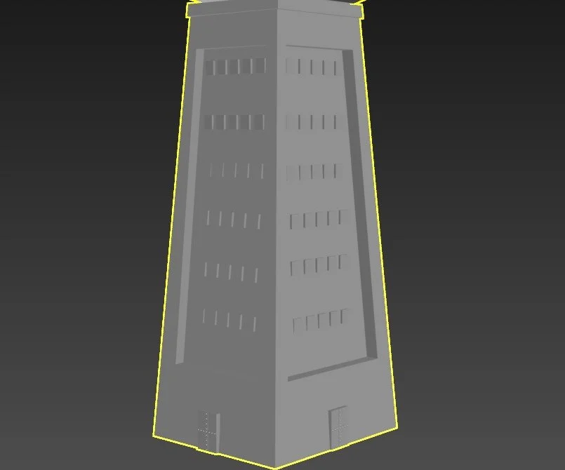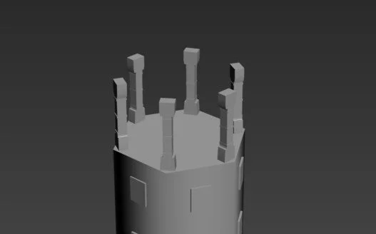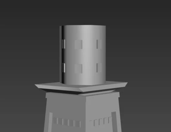 The Pillars were relatively simple, but, like the doors, I struggled to find clear references and iterations, so I decided to go with a cube-shaped pillar, which was a common design of the era, alongside the cylinder shape, which I decided to use for the support beams. The asset required me to select both faces and then use the extrude tool to expand outward, which created the pillar shape and also the curves around the edges and middle of the asset. I then cloned the model and moved it to each corner of the tower. I relied on the edges to help keep consistency and positioning accurate.